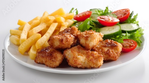 food, meat, meal, chicken, dinner, fried, plate, dish, salad, sauce, cookery, epicure, vegetable, grilled, tomatoes, cooked, potato, vegetable, roasted, delicious, grill, french fries, lunch, closeup, white, crispy, isolated, breaded, snack, tasty