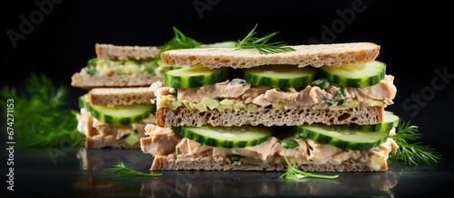 Chicken pate and cucumber sandwiches displayed on a dark table with empty space for adding more elements or text