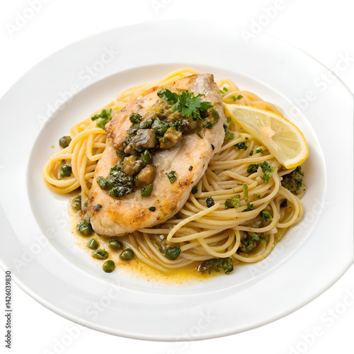 Chicken piccata with lemon caper sauce isolated on transparent background
