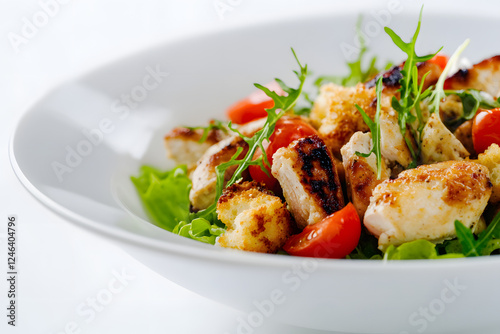 chicken salad with lettuce, tomatoes, and Parmesan croutons in a white bowl on an isolated background