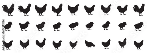 hen, vector, chicken, farm, silhouette, children, rooster, bird, isolated, illustration, animal, cartoon, set, domestic, white, poultry, collection, cock, cute, agriculture, icon, graphic, background, symbol, chick, flat, funny, character, baby, farm animal, farming, cow, element, horse, meat, goose, sheep, nature, design