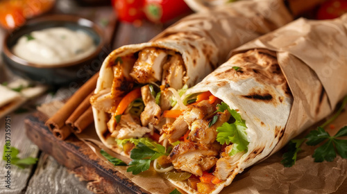 Chicken shawarma in a wrap. Popular Middle Eastern street food.