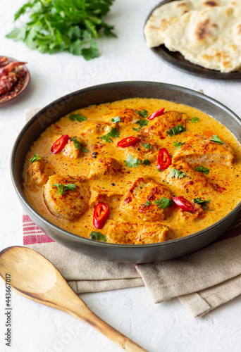 Chicken tikka masala curry with herbs and peppers. Indian food. National cuisine.