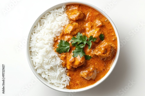 Chicken tikka masala with basmati rice isolated on a white, top view