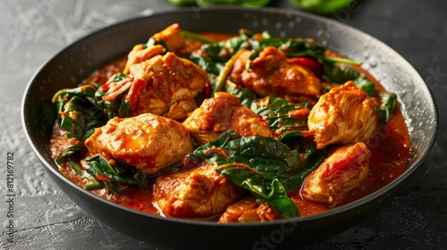 chicken vindaloo with spinach in black bowl portugueseinfluenced indian cuisine food photography