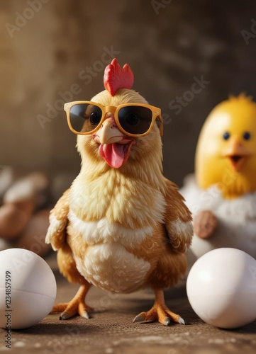 Chicken wearing sunglasses looking happy beside a freshly laid egg , chickens, country living, fun