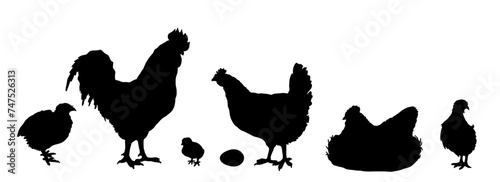 Chickens, quail silhouettes. Cock, chicken, hen, chick, egg. Domestic poultry egg farming. Isolated on white background. Vector illustration for farming products package, poster, banner, card design