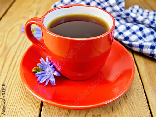 Chicory drink in red cup with napkin and flower on board