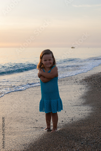child a girl in a blue knitted dress by the sea walks and watches the sunset. Turkey