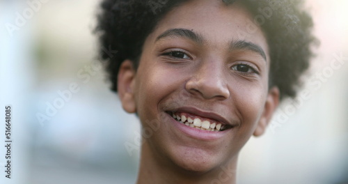 Child boy smiling to camera portrait, mixed race kid, ethnically diverse boy smile outside