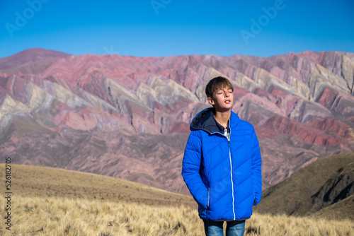 Child facing the sun with the Serrania del Hornocal in Jujuy, Argentina behind