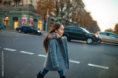 Child girl is walking across the city road at the crosswalk in evening.