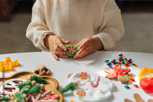 Child hands creating Christmas crafts. Child playing with play dough and Christmas decorations. Holiday Art Activity for Kids. Sensory play for toddlers.