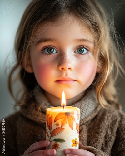 children, candle, decorated, floral, close, up, holding, innocence, light, warmth, glow, young, face, eye, freckle, sweater, pattern, orange, flower, cosy, autumn, detail, hand, magical, peaceful, serene, contemplative, gentle, soft, colours, ambience, artistic, charming, delicate, emotion, expression, thoughtful, beauty, youth, calm, harmony, imagination, purity, wonder, calmness