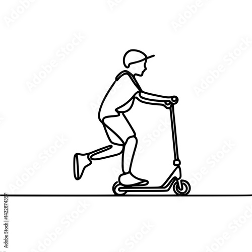 Child in baseball cap riding scooter in minimalist line art style, one line vector outline