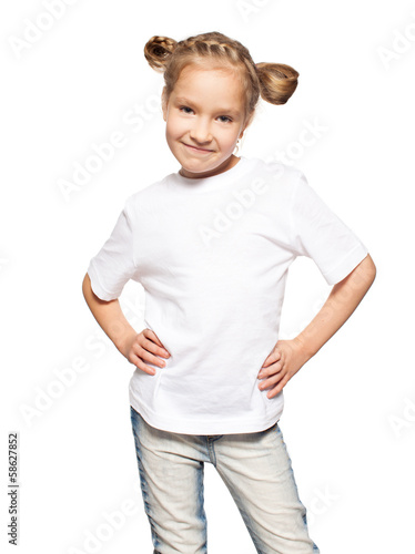 t-shirt, shirt, children, white, girl, blank, isolated, youth, young, fun, female, portrait, front, showing, childhood, human, photogenic, clothing, attractive, schoolchild, clothes, studio, model, people, top, 1, caucasian, fashion, posing, schoolboy, cute, smile, jean, lifestyle, shop, advertisement, cotton, standing, design, body, person, beauty, joy, looking, background, space, little, happy