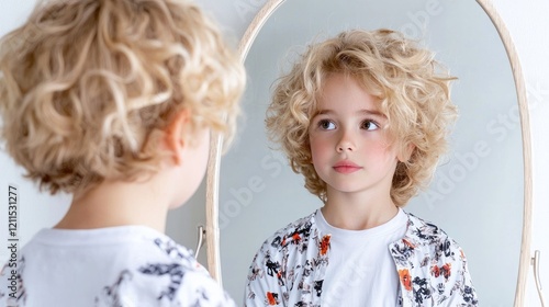 Child looking at reflection in mirror, bedroom, curious expression, playful mood, for children's fashion