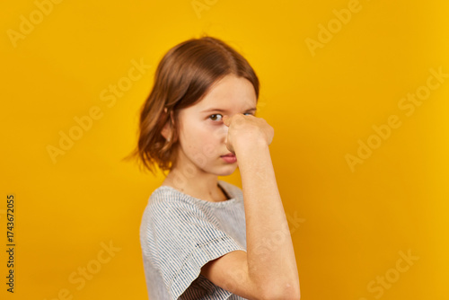 Child making a finger-pointing gesture against a bright yellow background during a playful moment