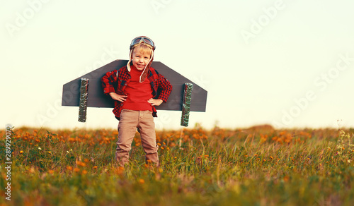 Child pilot aviator with wings of airplane dreams of traveling in summer at sunset.