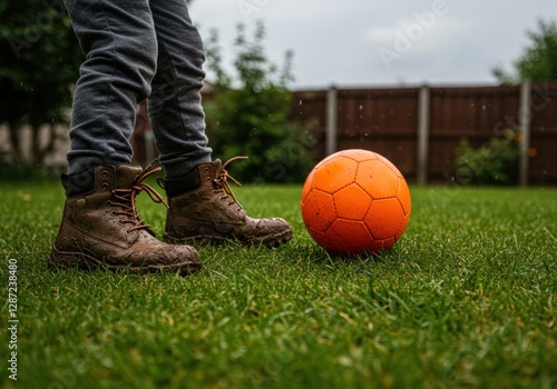 children, soccer, backyard, orange, ball, play, grass, boot, game, outdoors, fun, activity, children, sport, footwear, muddy, lawn, garden, casual attire, field, motion, leg, young, nature, spring, childhood, athletic, energetic, sunshine, leisure, enjoyment, fence, landscape, overcast, adventure, lace, excitement, standing, balance, daylight, hobby, fitness, health, recreation