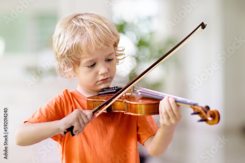Child playing violin. Remote learning.