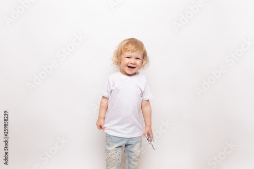 child playing with toy airplane against on a white background. concept dreams of flight
