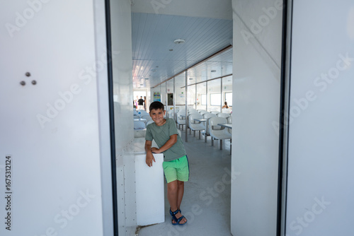 boat, trip, rose, children, boy, passenger, travel, tour tourism, vacation, summer, sea, coast, journey, transport, ferry, doorway, interior, compartment, smiling, happy, casual attire, leisure, adventure, exploration, family, fun, seascape, destination, mediterranean, spain, catalonia, costa, brava, cruise, sailboat, transportation, maritime, nautical, deck, cabin, ship, holiday, weekend, get-away, lifestyle, childhood, happiness, carefree