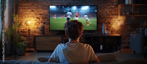 sport, game, television, watching, person, children, boy, home, living room, evening, night, sofa, couch, brick wall, entertainment, leisure, relaxation, indoor, lighting, dark background, backview, sitting, focused, concentrated, excited, intense, thriller, action, competition, soccer, football, team, player, match, technology, comfortable, cosy, interior design, lifestyle, family time