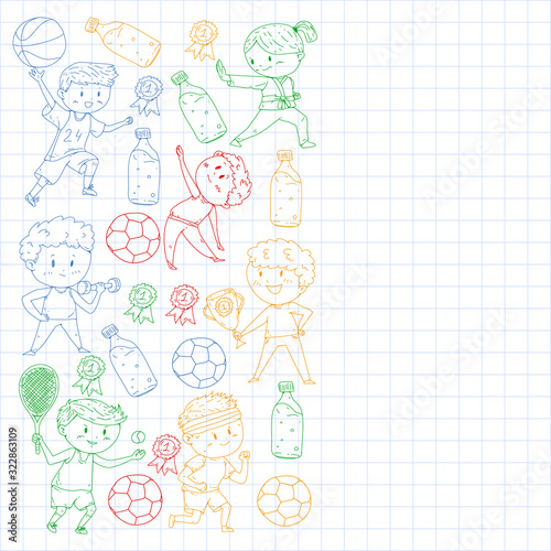 Children and sport. Vector illustration of activities. Football, soccer, running, dancing, martial arts. Health care in school and kindergarten.
