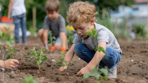 Children are actively planting seedlings in an outdoor community garden, fostering a love for nature and teamwork while engaging in hands-on environmental activities.