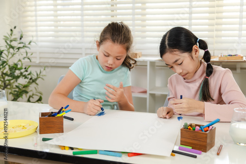 children, art, education, drawing, teamwork, girl, student, learning, classroom, homeschool, creativity, craft, activity, project, collaboration, friendship, bonding, childhood, development, skill, imagination, colours, colourful, pastel, wax crayons, marker, crayons, paper, canvas, vignetting, painting, hand, table, desk, school, study, lesson, together, diversity, multicultural, asian, caucasian, smile, happy, concentration, elementary, children, workshop, class