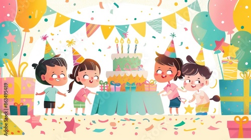 birthday, party, children, cake, gift, celebration, happy, smiling, colourful, decoration, balloon, confetti, joy, friends, fun, candle, table, present, gathering, together, cute, festive, sweet, adorable, joyful, bright, whimsical, cartoon, illustration, art, graphic, digital artwork, design, style, celebratory, event, childhood, pastel, candle, graphic design, people, artwork, little, children, digital, dessert, invitation, happy birthday