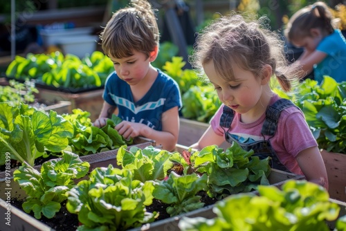Children doing gardening in a community garden ,picking lettuce