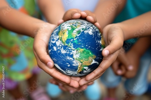 Children hands holding planet earth, Kids holding the world in their hands, Earth day, World environment day