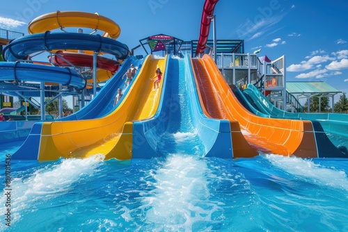 Children happily experiencing a variety of colorful and thrilling water slides at a water park, encapsulating the energy and joy of summer fun and adventure.