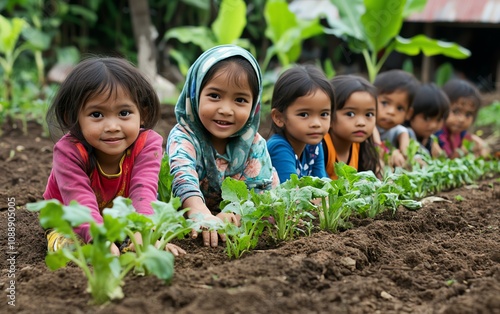 Children in a community garden planting vegetables, learning about nature, ecofriendly gardening practices, growing healthy food together