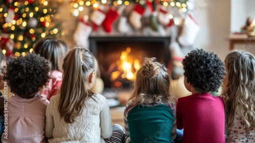 Children in festive pajamas sit joyfully by twinkling Christmas tree, surrounded by colorful wrapped gifts holiday decorations.