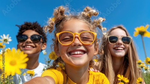 children, happy, flower, smile, summer, outdoors, friends, joyful, children, playful, field, youth, laughing, group, nature, sunny, fun, photo, smiling, yellow, daisy, blond, brown, black, friendship, affection, togetherness, happiness, image, closeup, portrait, summer day