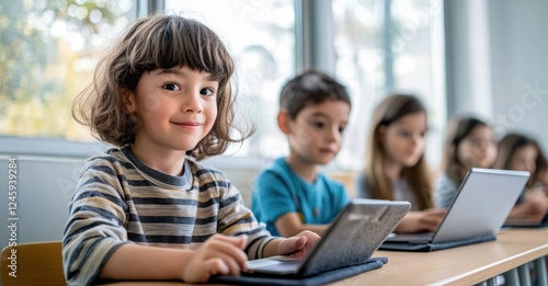 Children Learning with Tablets in Bright Classroom Engaged in Technology Education