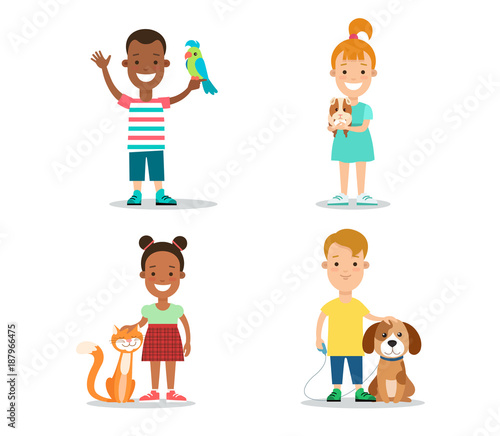 flat, cartoon, collection, concept, conceptual, illustration, infographic, vector, people, man, woman, male, female, fancy, stylish, creative, design, template, character, web, set, group, pose, family, children, children, children, boy, girl, son, daughter, happy, play, parenting, playing, walking, animal, cat, dog, guinea, pig, parrot, hamster, rodent, pet, home, care