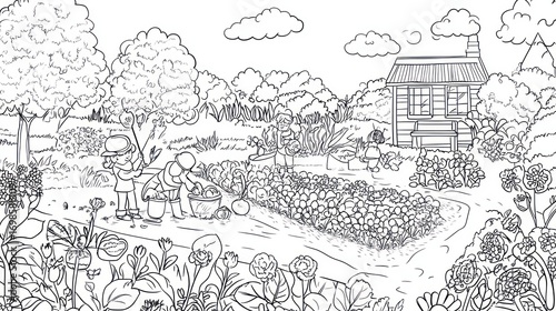 garden, children, bungalow, flower, plant, nature, spring, summer, landscape, children, planting, watering, gardening, vegetable, farm, rural, countryside, home, house, yard, field, blossom, bloom, greenery, leaf, dirtied, earth, growth, happy, fun, activity, hobby, leisure, illustration, drawing, vignetting, black, white, line, art, design, whimsical, cute, charming, peaceful, calmness, serenity