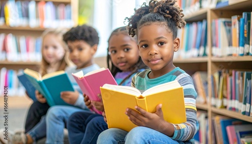 Children reading colorful books in library, symbolizing education, literacy and learning together.