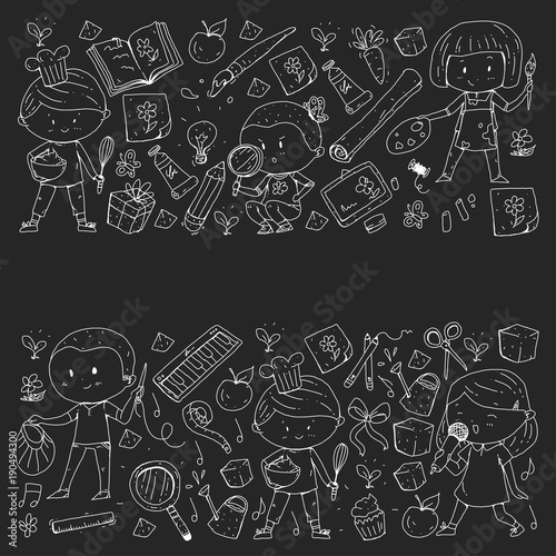 kindergarten, school, boy, girl, education, lesson, music, drawing, children, children, banner, leaflet, poster, doodle, icon, set, pattern, sing, research, creativity, imagination, science, class, preschool, cooking, sewing, mathematic, physics, biology, food, piano, crayons, chemistry, garden, book, literature, cartoon, play, study, vector, chalk, blackboard, hobby, learning, creative, imagine, design, art