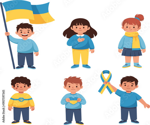 children, children, childhood, oneness, support, solidarity, peace, freedom, hope, awareness, charity, campaign, humanitarian, culture, identity, nation, patriotic, ribbon, flag, ukrainian, ukraine, blue, yellow, character, illustration, vector, cartoon, flat, design, isolated