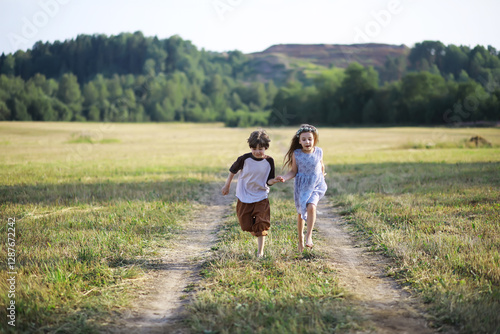 Children walk in the summer in nature. Child on a sunny spring morning in the park. Traveling with children.