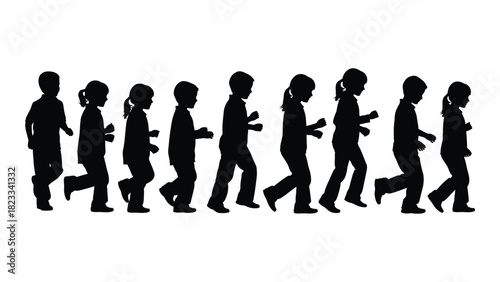 children, children, silhouette, walking, running, motion, group, line, boy, girl, play, movement, outline, vector