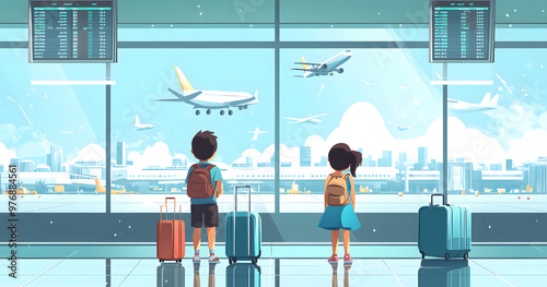 Children Watching Airplanes Take Off at the Airport with Luggage and Backpacks