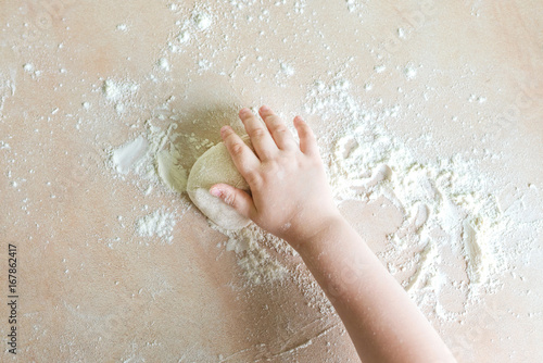 Children's hands make dough