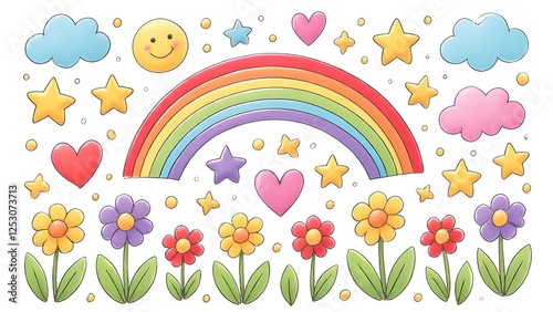 rainbow, flower, star, cloud, love, cartoon, cute, childish, hand-painted, fantastic, fresh, bright, colourful, children, kindergarten, decoration, background, illustration, happy
