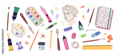 Childrens school elements. Art supplies collection. Painting tools elements set. Artistic materials collection. Paints palettes and brushes